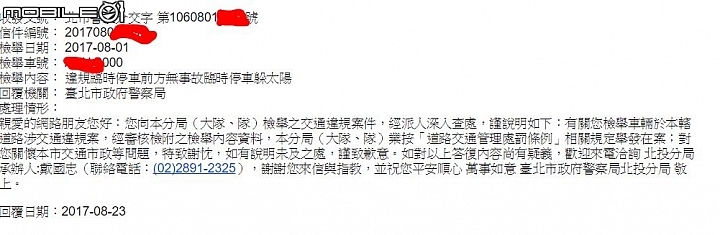 親愛的網路朋友您好:您向本分局(大隊、隊)檢舉之交通違規案件,經派人深入查處,謹說明如下:有關您檢舉車輛於本轄道路涉交通違規案,經審核檢附之檢舉內容資料,本分局(大隊、隊)業按「道路交通管理處罰條例」相關規定舉發在案;對您關懷本市交通市政等問題,特致謝忱,如有說明未及之處,謹致歉意。如對以上答復內容尚有疑義,歡迎來電洽查承辦人:戴國忠(聯絡電話:02-28912325),謝謝您來信與指教, 並祝您 平 安 順 心 萬 事 如 意 臺北市政府警察局北投分局 敬啟