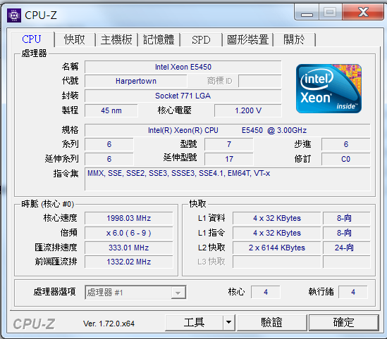 今天把電腦 E5300 2.5G 雙核 [http://www.cpubenchmark.net/cpu.php?cpu=Intel+Pentium+E5300+%40+2.60GHz&id=1098]拿去升級成 E5450 3.0G 四核 [http://www.cpubenchmark.net/cpu.php?cpu=Intel+Xeon+E5450+%40+3.00GHz&id=1236]WIN 7 CPU 分數 原本 6.1 >> 7.3重點是 原本跑 AVA 再開個 火狐 CPU 就一直在滿檔 100%,現在只有5x~6x%E5450 1000元風扇 200元一共花個 1200台幣,CPU 效能提升了快二倍CP值蠻高的這台電腦又可以再陪我個2~3年主機板是 ASUS P5KPL-AM現在使用起來沒什麼問題