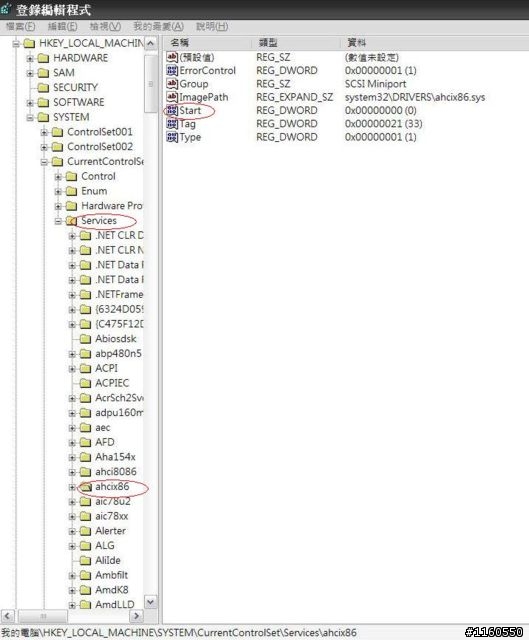 enm大大請問你有看到21樓和22樓的回覆嗎?21f樓主已說修改後,還是藍天白雲22f我有做補充,當然我寫的應該是有點模糊,抱歉!因為有遇到同樣修改msahci的start數值後,還是藍天白雲,當然最後也順利解決。不然樓主講修改後無效,我當然也無法再回覆補充。暫且我就當win7和vista是同核心的東西,就差win7比較流暢,免安裝一些驅動程式因為已經用回xp,就拿xp的圖說明一下圖中應該有看到紅色圈的Services,在它的底下有個ahcix86吧!(在win7 x64是顯示ahci x64)修改ahcix64(64位元)的start為0,將原來的msahci的start改回來的數值(沒改回其實也沒關係,也是可以進入系統,有試過沒問題,我自己是有改回,只是單純覺得既然是沒用到就改回的想法而已,當然也要謝謝enm大大提供不同的數值,所以改回的數值應該是以自己的為準)重新開機,進入bios將ide改ahci,儲存後,就能順利進入系統了當然這是以a社晶片組來說,i和n社叫什麼?我不清楚,個人猜測是跟按f6要用的sata驅動命名有關如你下載過a社晶片用的sata驅動的經驗,解壓後裡面有兩個資料夾x64和x86,裡面的東西就叫ahcix64和ahcix86msahci我就用上面的說法,是微軟的ahci驅動,至於i社是否叫iaahci我就不清楚了1.如果是用修改msahci裡的start成功進入系統,就我上次安裝win7的情形,裝置管理員裡的scsi控制器的開頭名稱不叫amd......,應該是Microsoft......,如何換回amd直接按右鍵更新驅動就好了(網路上有說)2.用ahcix64成功進入系統,scsi控制器名稱就是amd.....順便提一下,我的配備是1個硬碟和1台燒錄器,介面都是sata,無軟碟,主機板只有4個sata槽,bios裡只有動到ide變ahci,其他相關都是auto