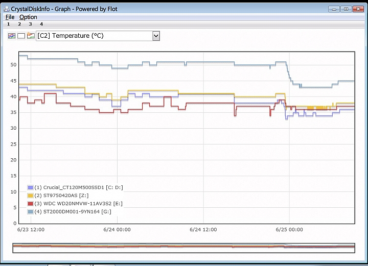 其中G(Seagate 2TB)與E(WDC 2TB)是負責相同任務,儲存相同資料(我用來備份照片、影片),Z只有DROPBOX同步,但是我有設定系統會定時自動將DROPBOX當中的手機拍攝的照片影片資料移轉到G與E當中,所以一旦有動作時等於三顆外接硬碟都要動作,只是一個是讀取後刪除,另外二個(G、E)卻只有存入動作。這個設定是凌晨六點自動啟動,所以可以看見WDC硬碟的紅色線會上升,但是同時間的Seagate卻沒變化,一直保持在高檔狀態。而備份完成之後WDC溫度明顯下降,Seagate還是沒啥變化。