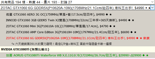 swaidatol wrote:2. ZOTAC GTX1060 6G GDDR5X(P10620A-10M)(1708MHz/21.1Ccm/註四年),$4990某網站寫得好像很厲害-->使用GDDR5X且是GTX1080的架構,緊咬1660 6G/海放1060 6G?這部分小弟不太懂,但素聞1060 6G本就是CP之王,這張是否也還不錯?...(恕刪) 1060/6G 在 4999 這個價位, cp 當然高啊..不然, 你去找其它的 1060/6G, 看是多少錢?4999 應該是來自 原價屋 (如下); 因為其它 購網, 拍網 全都找不到..
