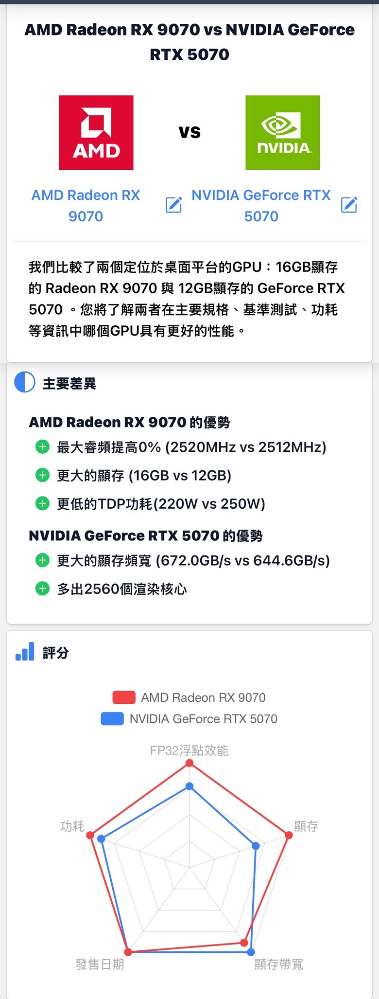 gottkk wrote:還是改用9070好了...(恕刪) 其實9070目前還是不值得換,和5070比起來還是太高價了。畢竟那是DDR6而已。如果你已經有上一代的7900XT以上顯卡,除非為了那少數的光追遊戲才值得買9070XT,不玩光追遊戲就根本沒必要。現在是N卡被奸商與黃牛炒價格,不然根本沒有A卡的生存空間可言。