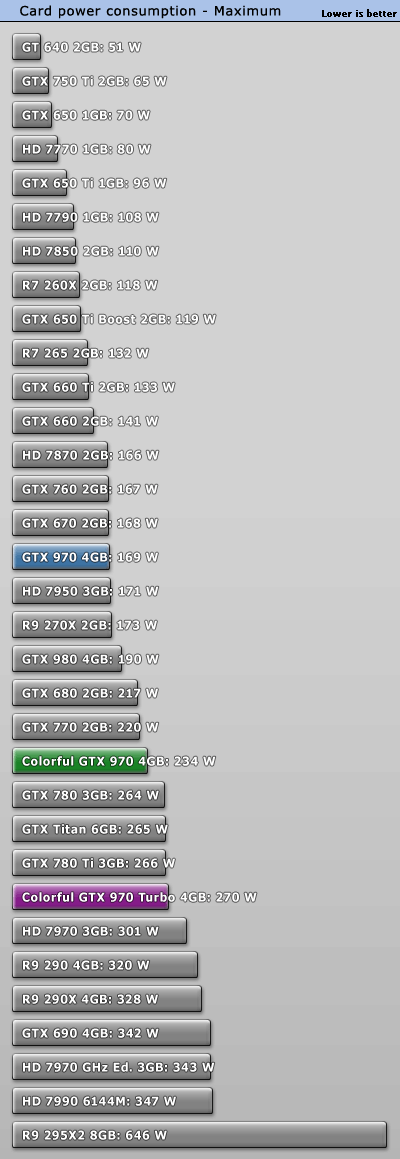 8156777 wrote:A卡我就不說了970...(恕刪) 馬上就等到你了XDDD 一定會說970的峰值耗電怎樣。來看一下R9 290X的最大瞬間抽電吧!(峰值耗電)公版的抽電大概是 300~315W,其實各家測試都差不多。(以下圖片每一張都是峰值耗電,平均耗電都更低)接著看 GTX970的,版上一大堆人,聽信謠言,用350W 400W去推公版970就算了,去推那種MSI閃電版 影馳名人堂GTX970,效能超好但頻率超高 POWER12V瓦數又不夠,請問這些人能不關機跳電嗎? 你看圖片其中就有一張超頻版超抽到270幾瓦了,350~400W能不關機?再來看R9 290X超頻版吃到多少電。這張卡曾經讓小弟我朋友被迫換PSU,他沒想到600W推不動,不過600W12V應該是沒足瓦。 自己看平均耗電跟峰值耗電差多少,再去看這張卡TDP多少。