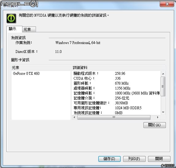 小弟就是用 460GTX 的人,不過是 ASUS TOP 1G 版的 460,系統是 Windows 7 Enterprise 64bit顯卡的驅動程式是安裝這個版本 :258.96_desktop_win7_winvista_64bit_international_whql可以正確安裝&使用,沒有問題。效能也很強悍 XD,Crysis 特效全開 可以穩穩地在 30張以上