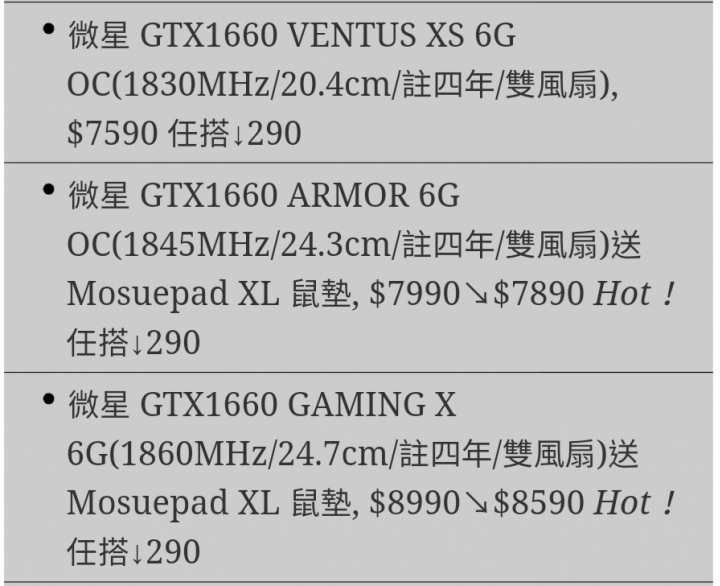 ★阿林★ wrote:一樣都是HTC 1660 6g顯示卡要買技嘉,華碩,微星哪個品牌好? 都說HTC了,怎麼還會有Gigabyte、ASUS、MSI的選項呢....不過HTC都跨到PC產業了,我一定處在平行時空1.1660的發熱不高,單、雙風扇就夠了,搞到三風扇實在沒必要2.哪一牌都沒關係,但是要記得每個品牌的1660也都有等級之分,普遍來說好的等級用料好、散熱好、調整好3.背板不需要,高科技竹筷就好,不然去買一個300多元的顯卡支撐架就好嚕