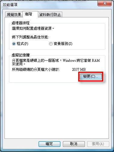 在系統內容中選擇進階-->效能-->設定,變更分頁檔位置與容量: