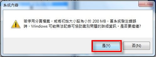 此時會跳出警告,主要就是因為完全關閉分頁檔可能會導致Windows當機,這部份先點選"是":