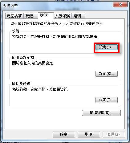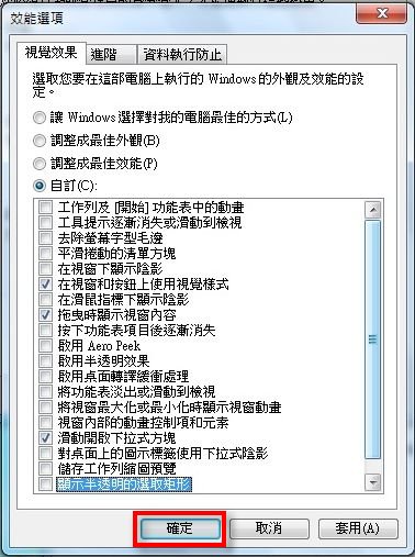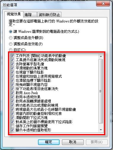 另外小筆電的用戶筆者建議可以將一些不太重要的視覺效果也關閉掉,首先在系統內容中選擇進階-->效能-->設定-->視覺效果: