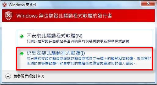 接下來Windows 安全性會詢問是否要安裝驅動程式,請選擇"仍然安裝此驅動程式軟體":