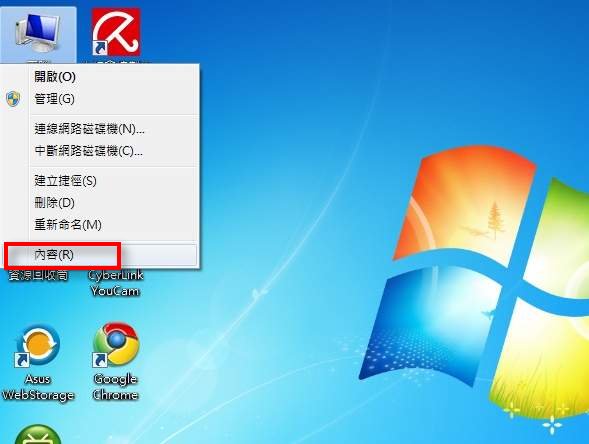 接下來的步驟其實就與優化XP一樣了,開始設定系統分頁檔位置,在"電腦"圖示(在桌面或開始清單中)上方點選滑鼠右鍵,選擇"內容"呼叫系統資訊: