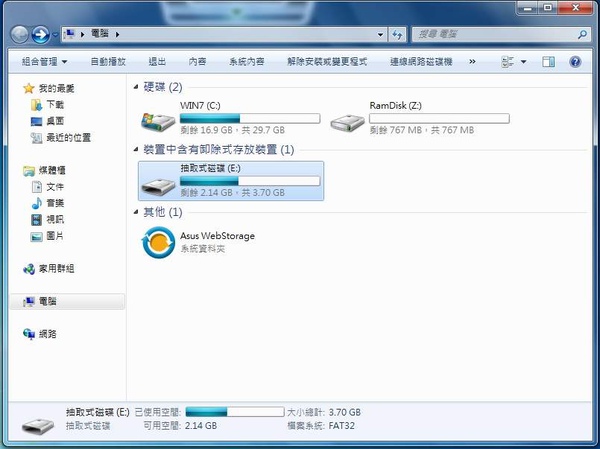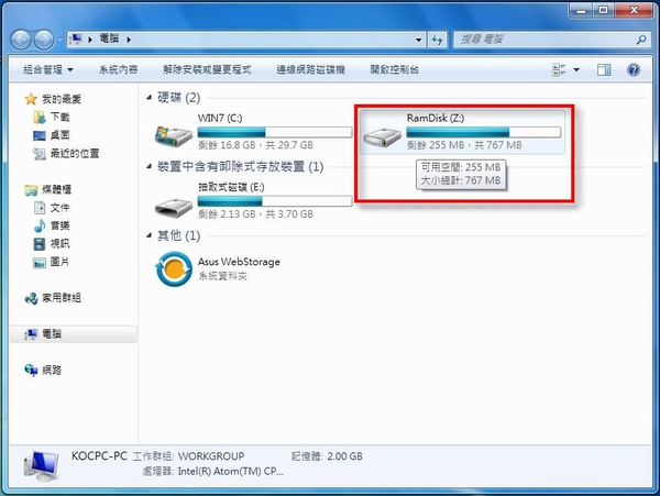 在我的電腦中現在就可以看到新增的虛擬硬碟(Z槽)容量768MB: