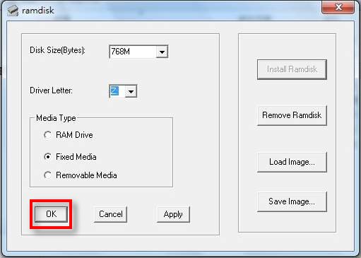 如此就可以設定Ramdisk大小,由於Windows7其實在1GB左右的記憶體執行一般軟體效果就不錯了,所以我個人推薦將2GB的記憶體分出768M,並將路徑設到後面一點(以免與隨身碟裝置磁碟機搞混),並將媒體模式設定為Fixed Media,最後點選OK: