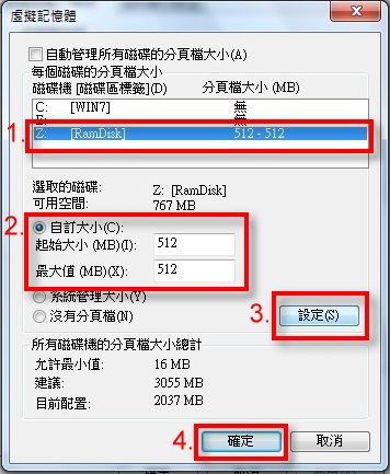 關閉C槽的分頁檔,並將分頁檔設到RAMDISK中,大小隨大家喜好設定,我的RAMDISK開768MB,所以分頁檔我設定512MB(如果系統有警告的話再開大一點即可,一般上上網打打字512MB夠用了),如果記憶體夠多的話當然就可以設大一點: