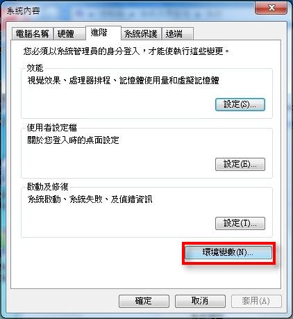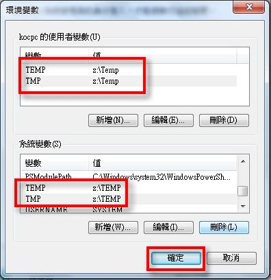 註:因為安裝軟體時安裝程式會將檔案複製到暫存目錄(TEMP/TMP)裡面,所以暫存目錄大小會影響到安裝軟體是否成功,如果要安裝大型程式的話最好將環境變數改到實體硬碟,或直接跳過本步驟。
