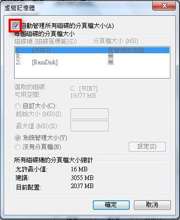 註:要關閉C槽原本的分頁檔只要先選C:-->沒有分頁檔-->設定,在分頁檔大小裡面數值變成"無"才是正確的關閉分頁檔喔!