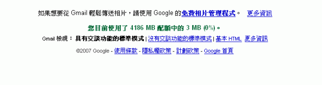 我有幾個Gmail信箱,其中最大的是,您目前使用了 4207 MB 配額中的 0 MB (0%)。但是這個信箱幾乎沒有在使用,偶爾登入看看廣告而已。次等大空間的是,您目前使用了 4182 MB 配額中的 80 MB (2%)。這個每天都登入,不曉得Gmail增加空間是用什麼標準喔?不過我根本用不到這麼大的空間,哈。