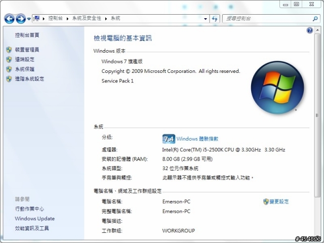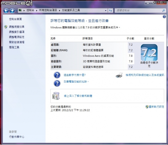 華碩 P8Z68-M PRO 主機板Intel Core i5 2500K 處理器美光M4 64GB SATAIII SSD 固態硬碟金士頓 DDR3 1333 4G 記憶體微星R6850 1GD5 顯示卡處理器的分數..被降了0.1分之前是灌專業版WIN7的是7.5現在灌旗鑑版..分數變7.4
