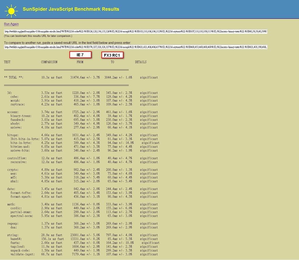 這段時間經常看到 Moziila 宣傳 FX3 的性能提升,特別是 Javascript 方面的提升。小弟不久前考完了期末試,空閒下來,就特意運行了 Sunspider Javascript Benchmark, 並且測試了一般人常用的 IE7 作為對比。勝負高低立見,FX3 以絕對強橫的姿態打到了 IE7。 總的來說,FX3 的 Javascript 性能是 IE7 的十培!