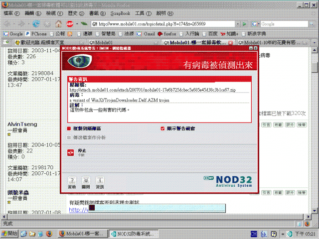keiichilee wrote:老頭使用的是NOD3...(恕刪) 嘿嘿。。昨天下載NOD32試用版,感覺畫面真是很[陽春〕,不過RUN了一天,對於我的系統沒什麼托慢,再加上裝了他之後,又掃出10多隻病毒==" 所以今天就線上刷卡買了一套啦~~