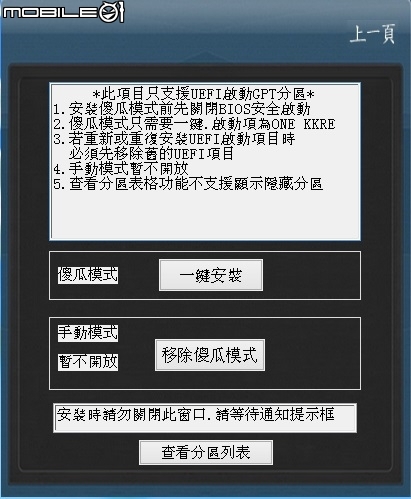 feelingming wrote:噹大有關於13樓畫...(恕刪) 你是要安裝在主機板的UEFI項目中嗎?安裝此功能電腦必須是UEFI啟動.並且在BIOS設定UEFI安全啟動為其它.你可能要爬一下文!不過並不是每一台電腦都支援.有些電腦只支援微軟認證過的才會顯示UEFI項目.(一般桌面型應該都有支援)1.下載USB雙版本(此功能在64位元當中)2.製作成開機隨身碟3.由UEFI隨身碟開機4.進入介面後---進階---安裝平台到UEFI項目---一鍵安裝註解:安裝成功後.開機一直按主機板的快捷鍵會出現ONE KKRE項目5.安裝成功後重啟並進BIOS設定UEFI安全啟動為其它OS測試UEFI項目啟動時的GHOST一鍵備份還原