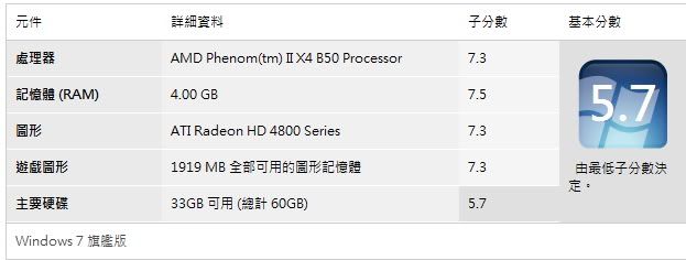 處理器 Intel(R) Core(TM)2 Duo CPU E8400 @ 3.00GHz 7.0記憶體 (RAM) 4.00 GB 7.1圖形 ATI Radeon HD 3870 7.0遊戲圖形 1919 MB 全部可用的圖形記憶體 7.0主要硬碟 41GB 可用 (總計 78GB) 5.9Windows 7 旗艦版
