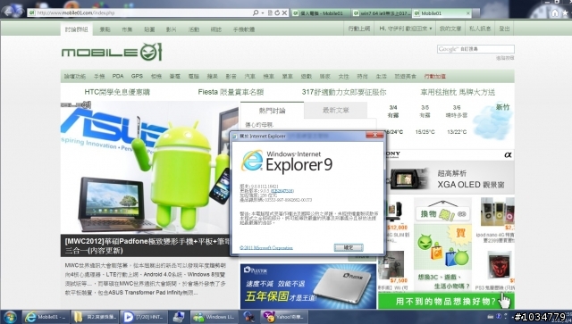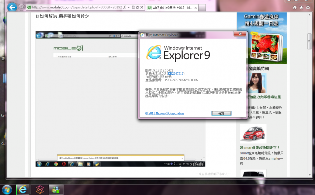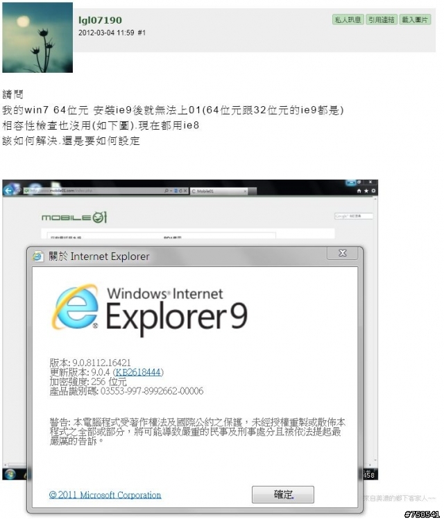 lgl07190 wrote:請問我的win7 6...(恕刪) 你的IE9圖示怪怪的那是7/8版的圖示,看來你IE9似乎沒有裝好從IE9推出到現在,從來沒有無法進入01過的情況IE9開很多分頁也都很順,不像Chrome,多分頁一下就把資源耗光了而且GC最近很不穩,走下坡了