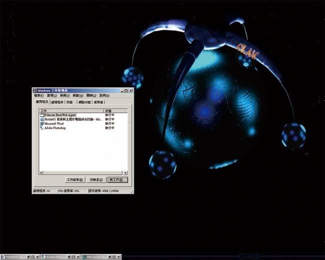 我的電腦昨天用還好好的,今天開機螢幕上卻只有桌面圖片,其他什麼東西也沒有,下面沒有工作列,桌面上的快捷圖示、檔案都沒有了,但是有滑鼠游標,按鍵盤也可以用,但滑鼠右鍵在桌面沒反應,我可以用Ctrl+Alt+Del開「工作管理員」出來,用「新工作」來開檔案和程式用,可以看到檔案都在,也可以上網,用起來都正常,只是輸入法不能切換,下面是我桌面現在的樣子,請問有人知道大概哪裡出了問題嗎?謝謝!