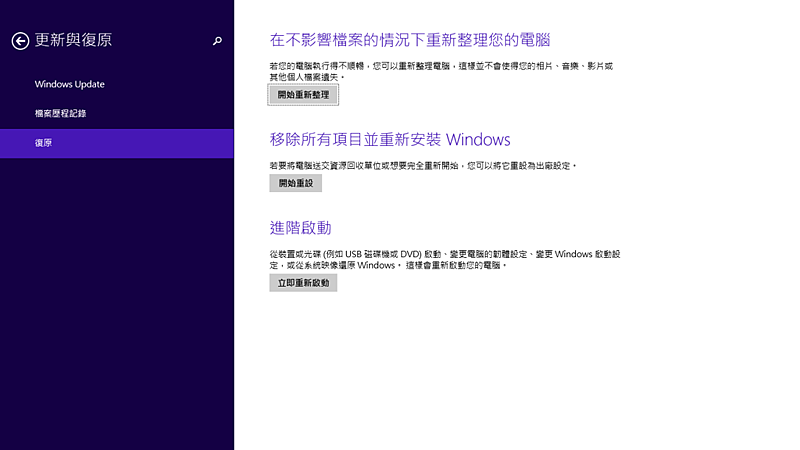 ●當初發生問題時,因一時情急,有做了一個動作『在不影響檔案的情況下重新整理您的電腦』