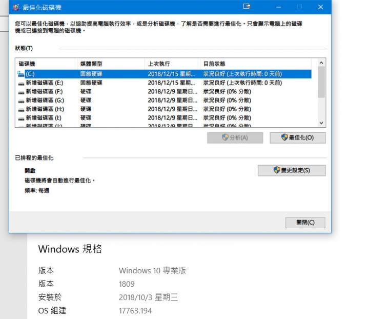 前言:W10的磁碟最佳化對於SSD並不是傳統的重組,而是只使用TRIM,並不會加速SSD的耗損昨天在開啟磁碟最佳化時,卻發現竟然顯示無法使用上次執行日期為6號,代表之前都是正常的6號至昨日有歷經了2次系統更新,也不敢斷定是否更新後把此功能拿掉了跑去問了微軟叫我重裝1809也試過了,還是一樣所以想問問有沒有同版本同組建的人幫我測試看看是否是更新的緣故或是有高手能解答為何會變這樣 感激不盡SSD為MX500 250G