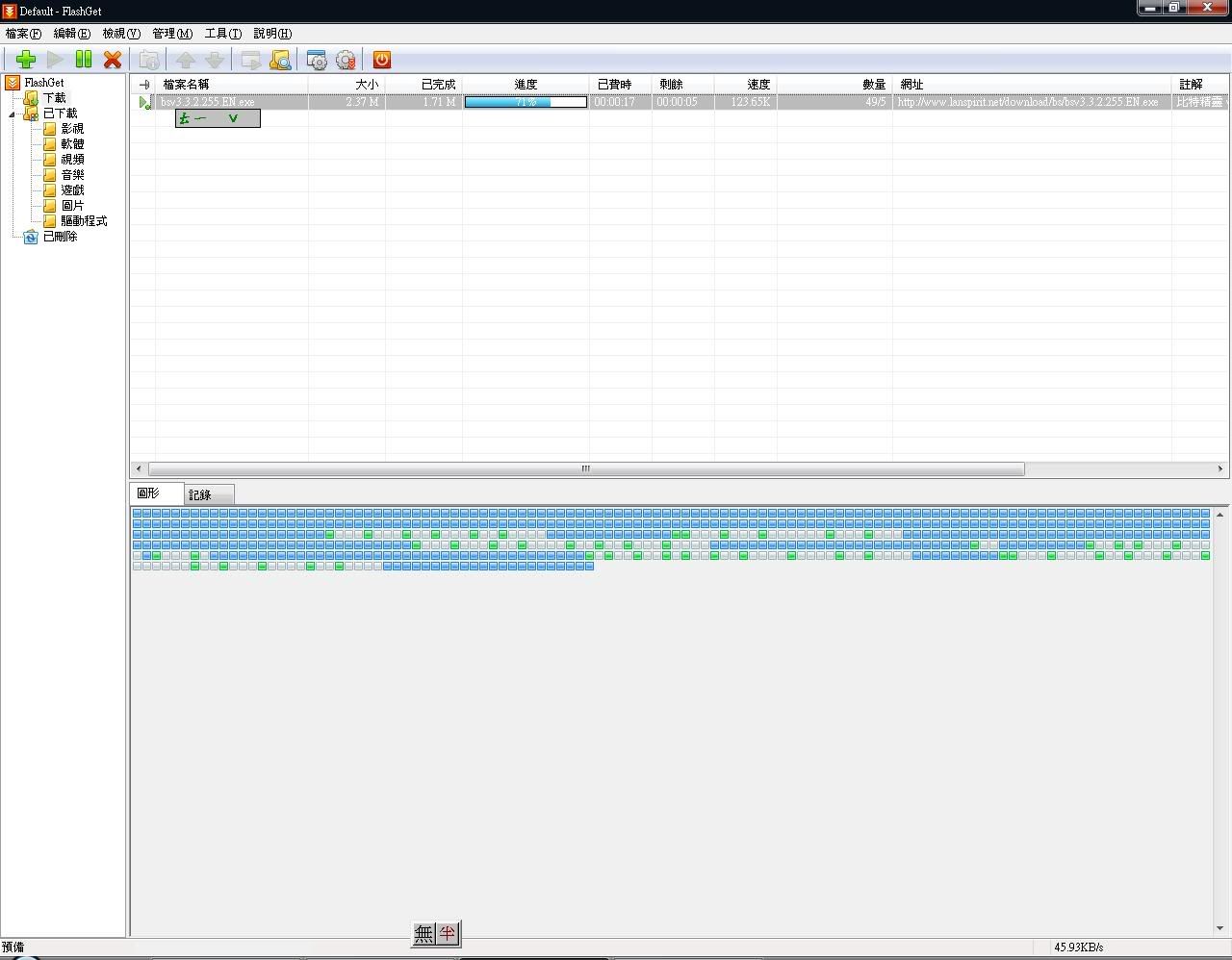 我下載時慣用FlashGet,平時安裝這軟體也不會去特意更改設定。這陣子發現下載的東西,經常卡在90%↑就不動了,要過數分鐘至十多分鐘才會完成100%!點下載檔案的圖形發現FlashGet把檔案切成「幾十個點」在下載!!我不曾動過設定,怎麼會變成那麼多個點!?記得以前是八個點而已。(一樣沒動設定,我也不知怎麼設定 )附一張圖供大大們參考:(也煩請大大們教一下怎麼改回來!感謝!!)