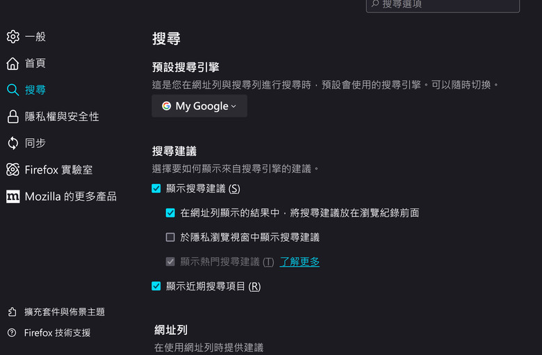 1tac wrote:山不轉路轉, Chrome...(恕刪) 謝謝開版及1tac大大參考你們的討論終於成功FF使用 Add custom search engine輸入https://www.google.com/search?qs=%&num=100然後進到FF設定搜尋引擎的頁面把Add custom search engine輸入的設為預設搜尋引擎這樣以後使用搜尋選單送出就直接用G搜尋100篇的結果