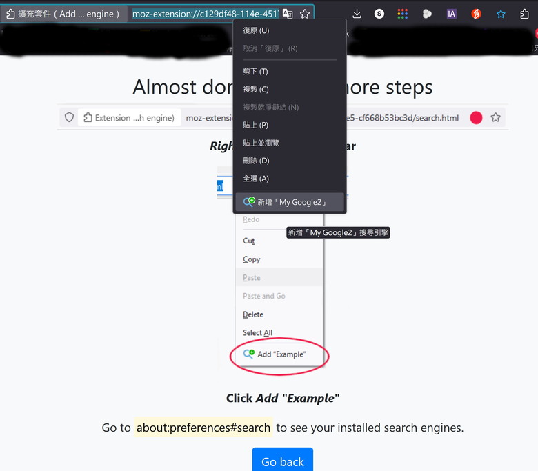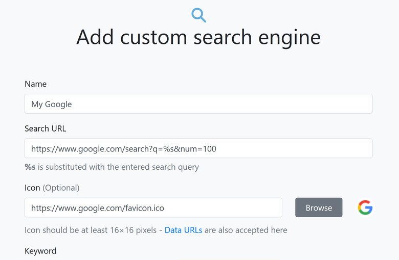 1tac wrote:山不轉路轉, Chrome...(恕刪) 感謝分享我常用FIREFOX 所以找了Add custom search engine安裝只要照做即可https://www.google.com/search?q=%s&num=100藍色 ADD按下去到下一頁在網址列-右鍵-去ADD你的引擎在去設定-搜尋-設定你的引擎以後搜尋到網址列打字即可