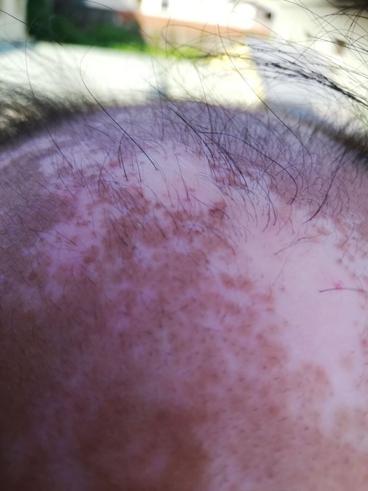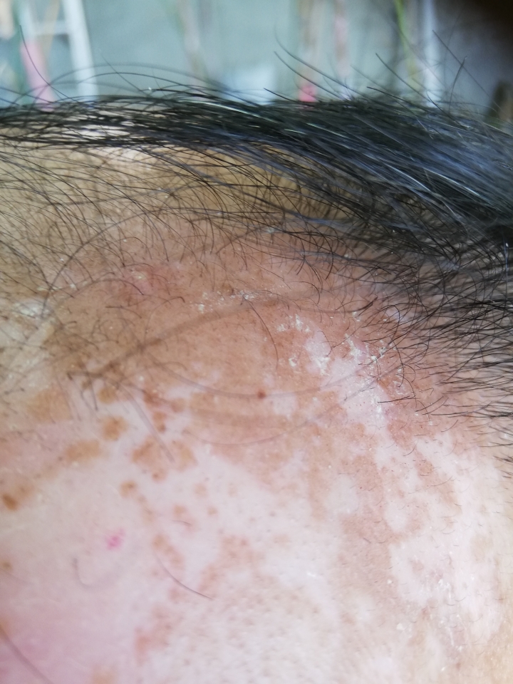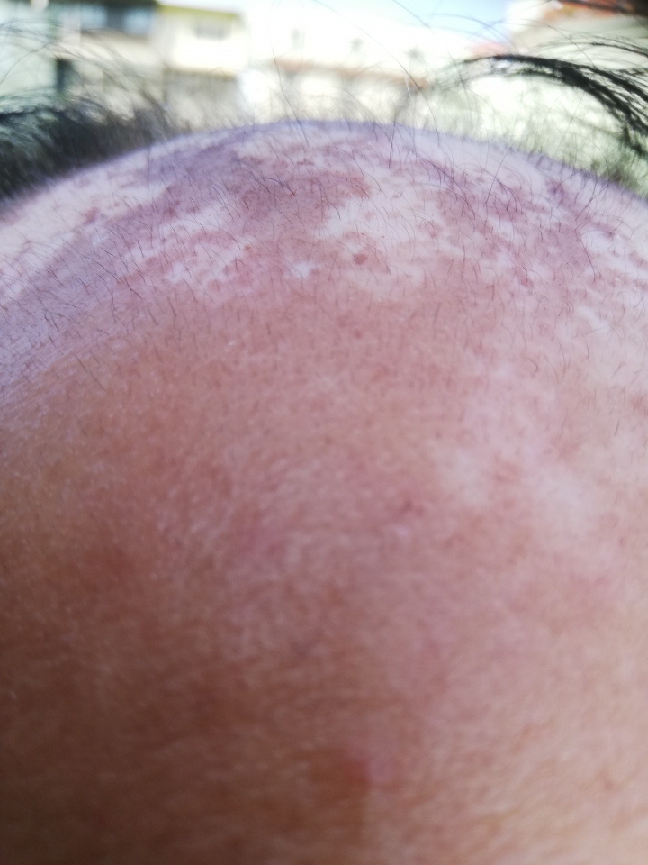 我固定在星期六晚上施用微針。上一個星期六接種疫苗,除了手臂酸痛外還有些微的頭痛,因此打定主意當天不施用微針。停了一個禮拜沒有微針,今晚要開始下針滾扎時,心中竟然有些生疏和膽怯。拗不過心中對生髮的期望,最終還是忍著痛楚完成今晚的微針。有一段時間沒有更新微針狀況,貼上一張最近前額照片。靠近照片中間右邊的紅點是原先紅點標記,各位可以想像其相對位置。