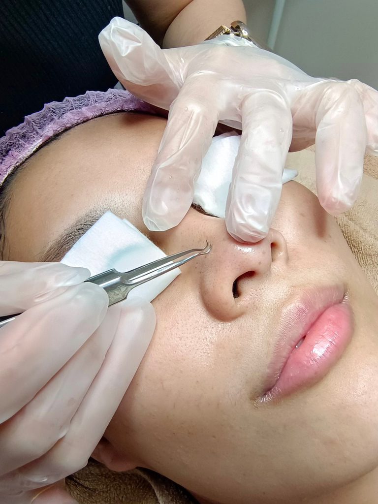 ▼中和多餘的杏仁酸後,開始清除鼻頭、臉頰粉刺,手法很輕柔、不會硬擠