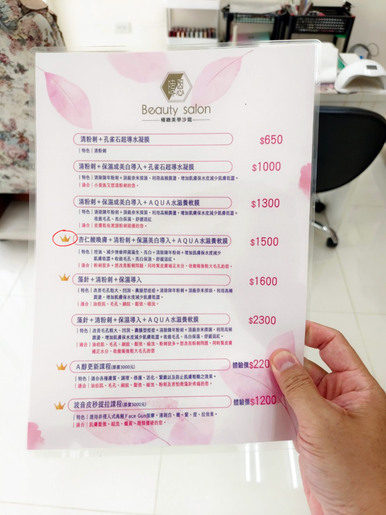 ▼暐恩價目表,價格透明,方案自由,可以根據自己需求綜合美容師建議選擇方案。紅色圈起來的就是今天要做的方案:杏仁酸喚膚+清粉刺+保濕導入+AQUA水滋養軟膜