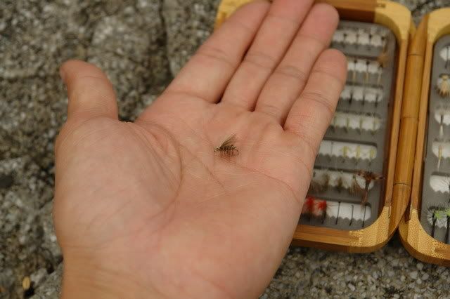 溪釣flyfishing不免要專研一下水生昆蟲,圖中手掌上的毛鉤便是模擬石蠶蛾成蟲(caddis)。