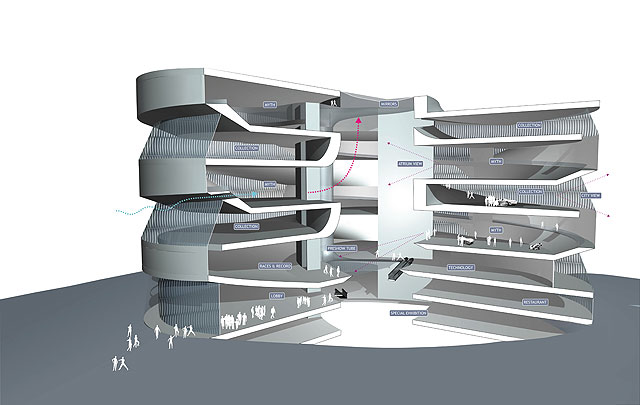 從頂樓開始往下,整個建築採雙螺旋的設計,傳奇螺旋是依照年代展示車輛的演進,收藏螺旋是主題展示。