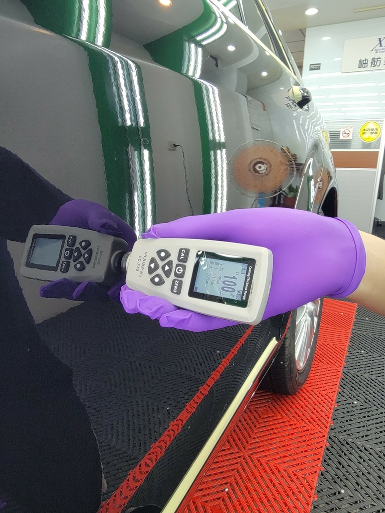 ▼洗車完成後,老闆測量車子金油層,確認金油層厚度。