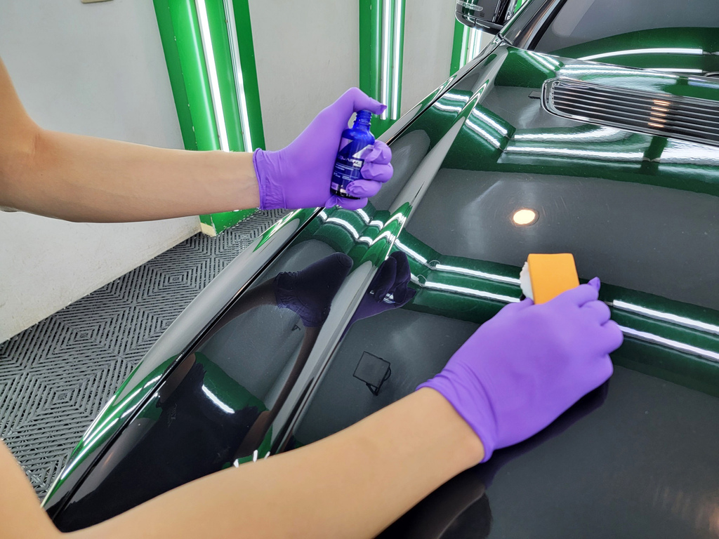 ▼拋光美容完成後,老闆開始進行鍍膜,使用CarPro鍍膜劑均勻塗抹在車身表面,讓車漆光澤度更高,並具有高潑水自潔能力、防污、抗氧化、抗UV等保護。