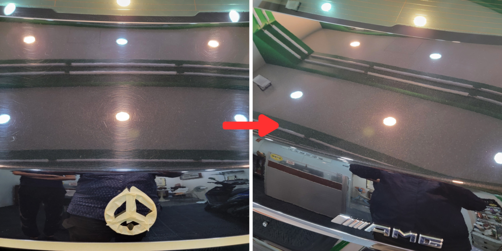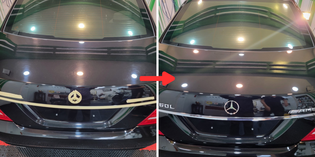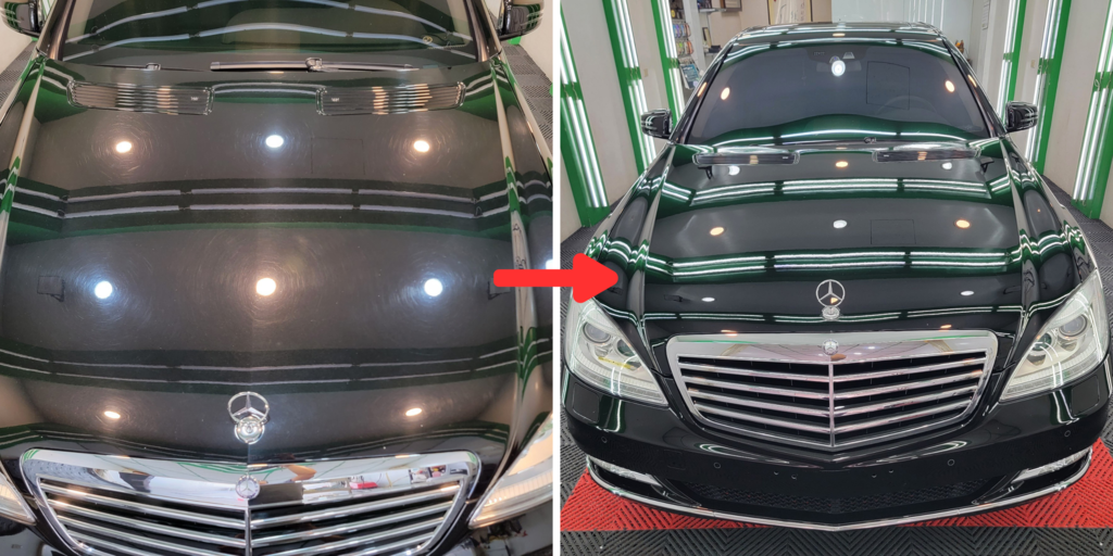 ▼完工後,老闆把車子還給我。當我看到完工後的車子,真的驚豔了!發現車身光亮如新,細紋完全消失了!我覺得看起來就像新的一樣!簡直不像13年老賓士!整台車大回春!