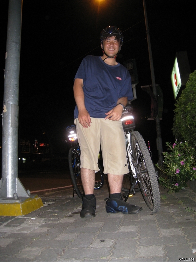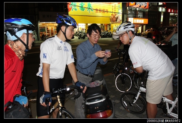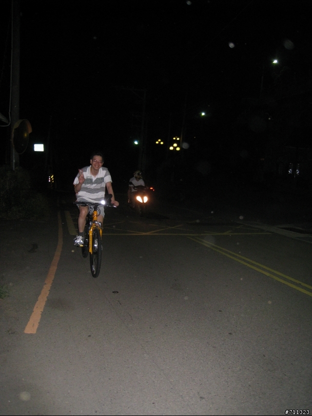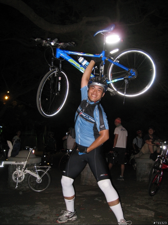 照片來囉!!!!!大家好我是新腳小胖,這次由小弟為大家做關東橋夜騎的實況報導首先是昨天最早抵達的車友。因為太拼命了,那麼早就到所以給他一張獨照XD喔,MASH現在變成了夜騎軍團的常客了!!不管是田園還是關東橋都會出現!!(迷之聲:那晨騎怎麼辦)咦,這位坐在車子車牌號碼為0800956956的中年男子是誰??怎麼笑得那麼開心。MASH說這年頭腳踏車不只漲價,還越作越大,現在都大到跟摩托車長的很像了。不過威廉沒戴安全帽這樣不行喔,竹蜻蜓是很講究安全的車隊喔威廉這時候在炫耀新版的i-CASH卡了,可惜大家都沒買,所以只能看著一疊疊的卡片流口水這時候其它的車友也漸漸的抵達集合點了。威廉又繼續show他的i-CASH卡了,真是令人羨慕。第三批我一定要跟到終於要開始今晚的活動了,威廉趁機拿起相機趕快拍幾張大合照回去交差。(不過隔壁走過去的美眉在偷看威廉喔,要是被威廉嫂知道了大概回去要跪殺人踏板了。說到這,該不會威廉今天是假借加班之名,偷偷去跟竹師妹聯誼吧)大家終於浩浩蕩蕩的出發了。不過一出發馬上就被金山街的紅燈擋下來 正好趁機趕快拍幾張照,順便點一下人頭,居然有17個人之多說,嚇死人了!!!(一開始小弟耍寶點錯數量了,後來一數又變多了。所以有車友提議下次要點有幾雙腳,才不會回家多了好多....朋友你沒腳怎麼還可以騎那麼快)轉往園區五路的時候又被紅燈給擋下來了(確定是五路了,剛剛去金山街吃飯的時候順便確認)今天第一次看到待轉區的格子被腳踏車全部塞爆在交大舊南門口前面大家還是很遵守交通規則的停了下來。(昨天有改變一下行程,在園區三路右轉到這條再到交大會比較順。)在交大校園裡車友肆意馳乘。這張是將相機朝後盲拍中唯二成功的照片之一。這張是盲拍的最高境界-完全盲拍,只能說運氣太好了有拍到人,前面幾張都拍到月亮跟樹告別了充滿美眉的青春校園,一夥人來到了18尖山。奇怪!?明明是上坡為什麼拍起來像下坡一樣,而且大家看起來都游刃有餘的樣子,看樣子下次要加碼高峰大斜坡回來好了和之前不一樣,今天在18尖山的最高點就休息了。一方面是考慮到後面的車友還在慢慢努力,加上這邊有飲水機可以補水。不過後來要下18尖山的時候還有原本在這裡的兩個車友也跟著一起騎到路口就折返了。趁著休息的時候趕快練騎舉車,不然等一下在出口處要抬車怕會抬不起來挑戰高峰路的時候,上次爬的氣喘吁吁的車友看樣子最近有偷練喔,這次居然海放我這位朋友,下次記得要戴安全帽出門喔,畢竟安全是回家唯一的方法。(我還在新腳的時候也常常忘記帶東西,每次都要衝回去拿讓MSAH等了好多次。不過我現在也還是新腳啦)大家在高峰路和高翠路交叉口的全家休息一下。順便宣傳一下叫大家加入晨騎 (咦~~MASH好像消失了!?原來是怕太晚回去晚上又要補課所以先回家了)好不容易終於又回到園區了。大家正在停園區三路左轉寶山路的紅綠燈。等一下就要啟動今天的隱藏行程-寶二水庫了!!!當然是開玩笑的啦,要是真的帶大家去寶二禮拜五大概又只剩小貓兩三隻了 (話說高峰大斜坡滑下來的時候大家看起來都很滿足,喜歡這段路程的人可以參考一下一、三的清大晨騎喔,我們都會從這邊溜下來,享受一下早晨馳乘的快感!!)左轉回老爺的時候大家都有乖乖的停紅燈喔。竹蜻蜓是個超遵守交通規則的車隊,希望大家騎車要繼續注意交通安全喔 (這次特地將紅燈拍出來證明我們在停紅燈,不是我騎不動所以停下來休息)抵達老爺的時候雖然有些人中途先行離開,不過加上小弟還是有13個人,陣仗還算蠻大的。瞧大家滿意的表情,希望禮拜五的時候大家還是可以出現喔雖然昨天臨時被委以重任,但是還是準時在10點前將大家平安的帶回了老爺門口。不過經過清大的時候由於陣仗太大,一時間大概被以為是飆車族入侵清大校園嚇壞了一些小學妹(來,乖,叔叔秀秀),看樣子以後負責安撫美眉的重責大任只好交給我來執行了對了,昨天趁著威廉不在,偷偷推廣竹蜻蜓拍照要舉車活動,歡迎大家熱情響應