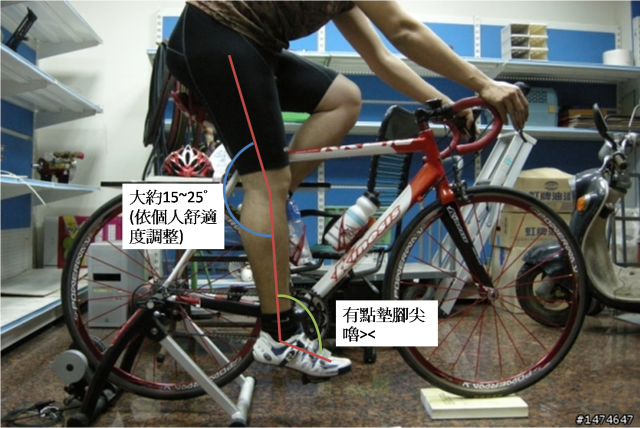 1.坐墊高度降低+1,讓膝關節略為屈曲。(約15~25度)...(也有書上寫15度or 15~30度),個人覺得依您的舒適感來決定嚕,畢竟要騎長程,還是要以舒適度為主。