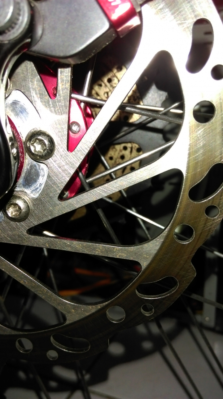我的也有類似這情況..不過我的才安裝..半個月多而已一般正常看的情況下只覺得是髒東西..但是擦不掉(並非煞車卡鉗區域是..中間那區域)剛剛用手機閃光燈一照之下變這樣子..可能是近期剛好騎乘回來有噴雨..有被噴到忘記擦拭..可能才變這樣子但是我想詢問我煞車區..為啥看起來像是生鏽