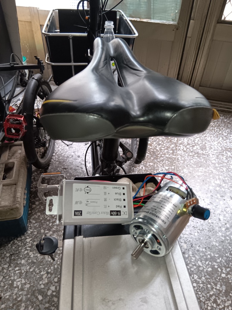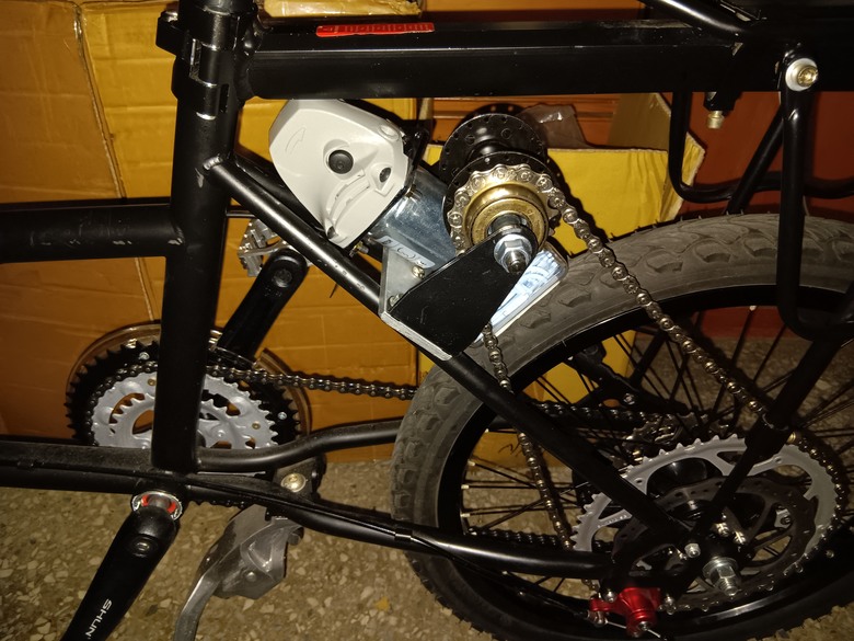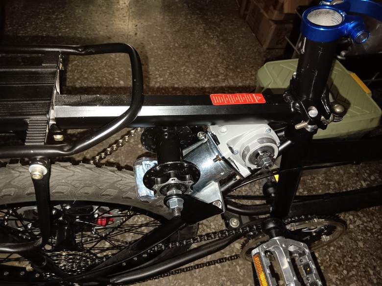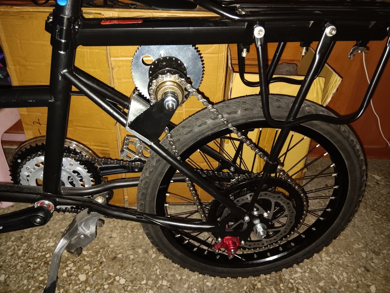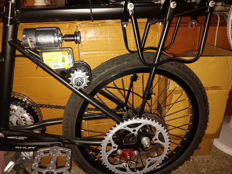12T飛輪到!三級減速; 第三級自行車鏈減速比52/12=4.33一級減速是砂輪機傘齒輪40/11=3.63,買整個機頭齒輪箱省許多加工,只需鐳射割鈑件,pinion孔不同得車一個轉接軸套二級減速用25H鏈條,49cc mini摩托車有合用的大齒磐,小齒7T太小,有11T馬達鏈輪可用,減速比5.6如上整合後,車速在平地約30km/hr,也具備爬坡能力