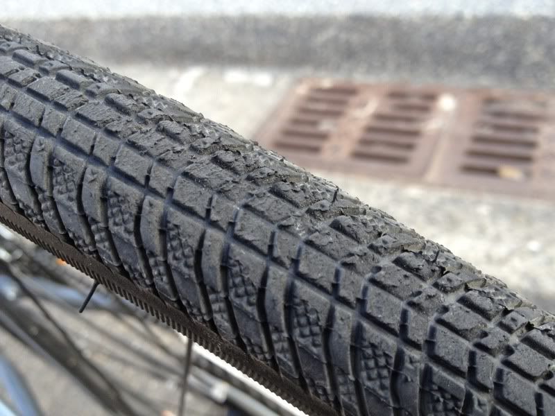 從前有條m牌車原廠配的廉價胎已騎到開始出現許多小裂痕,那時很白痴的想試著,看能撐著騎多久.就這樣快半年多吧,三不五時就聽到輪胎"啪的一聲"裂更大,直到外胎上遍佈大大小小裂紋,偏偏就是上山下海還能騎(燕子湖,大溪,三坑)最後反而是因為時常擔心發生意外,出門束手束腳沒法好好騎,只好對那2條外胎投降,換掉了事.