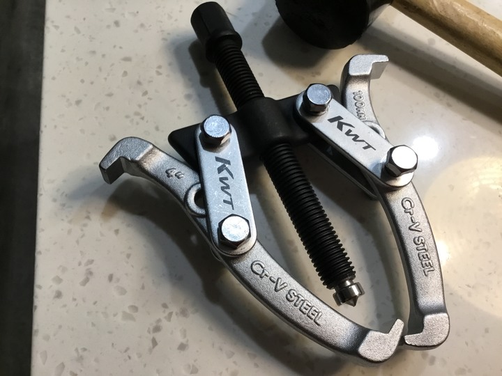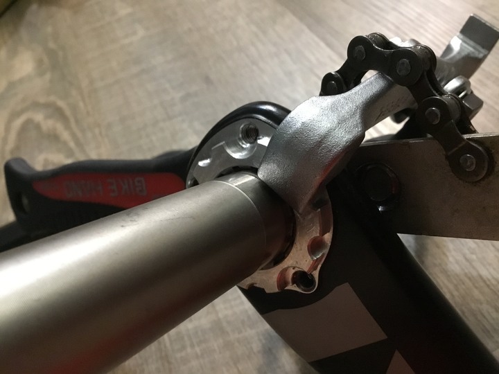 各位鄉親父老 我成功了 還真是要老命簡單說就是用拔猴(拔輪器)逼進去 扳手力矩要40cm以上 要邊轉邊上油剛剛測試上五通尺盤 還好沒有偏擺押入進度前50%還算輕鬆 後40%很累人 最後10%很想死最後的10%會有金屬釋放壓力的乒乓聲此戰役犧牲的飛輪扳手 也扮演反作用力矩角色 是這次致勝關鍵 明天拿筷子可能手會抖我有查到原廠是用油壓機 徒手真的很草菅人命 哈哈完工後才想到可以拿去輪胎行 用氣動打