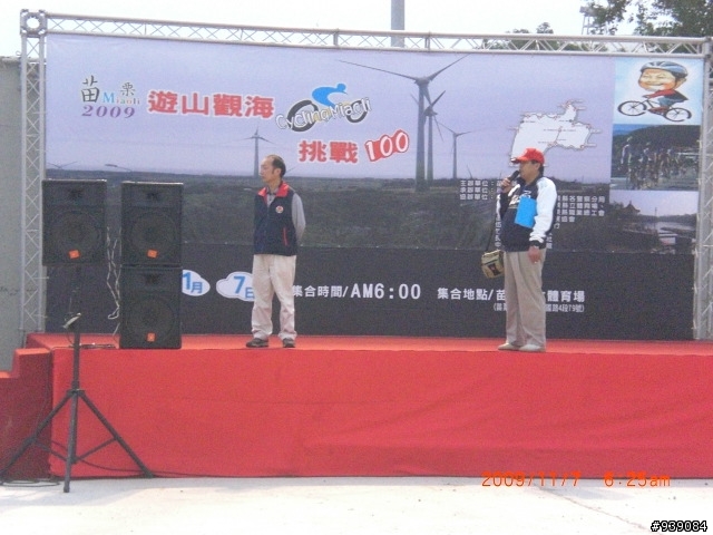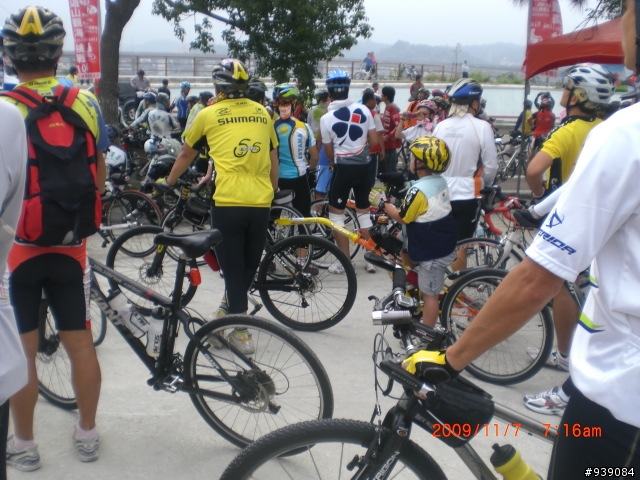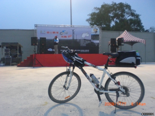 我是本縣人,騎回到會場,剛好趕吃午餐時間﹝中午12點﹞,剛開始騎尖山隧道,才知道完蛋,變速不順,一路騎的好辛苦,好在平時有練,我騎的是24速登山車,穿MOTOROLA車服,我11月1日還有練苗栗→錫隘隧道→汶水→豆腐街→汶水→銅鑼→苗栗,獅潭到汶水,被狗追3次,我目前要規劃環苗栗線,以便準備可能的200公里!我的腳踏車↓中繼站↓,我約11點到,另外這對﹝黃衣服拖車的﹞,應該是父子↓,他們也是12點多,不到1點就回到會場。
