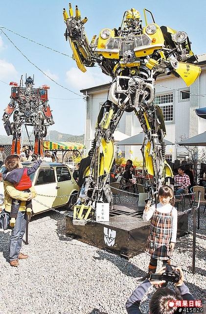 〔記者佟振國/南投報導〕金剛基地誕生!南投縣埔里鎮庭園造景業者梁乃元,因為兒子超迷電影「變形金剛」,去年起陸續以廢棄建材與報廢的迷你奧斯汀汽車,打造高度超過四公尺的變形金剛「柯博文」與「大黃蜂」,滿足兒子渴望擁有機器人的願望,最近他的工作室開放參觀,吸引大批遊客前來朝聖。