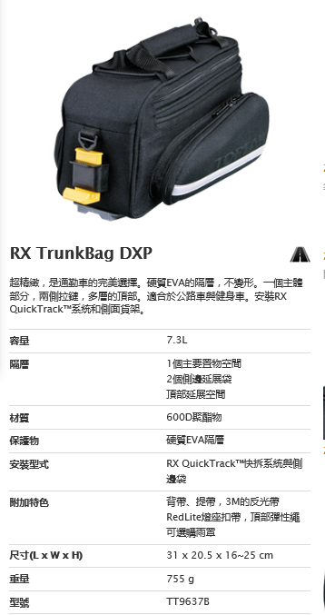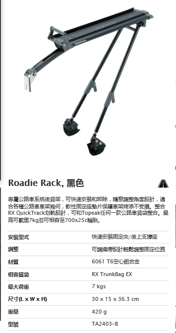 好多車友詢問貨架跟馬鞍帶,我統一回覆一下,因為是碳纖維車,所以規格跟一般車子不太一樣,我選擇的品牌是Topeak至於為什麼選這品牌,是"景美蛙不停"老闆推薦的,老闆很熱心,至於更專業的問題可能要親自問他喔!小弟了解的也有限!貨架跟馬鞍袋的型號圖示如下:希望對車友們有幫助!貨架馬鞍袋