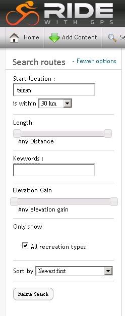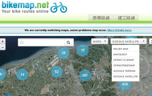 最近Bikemap.net把 GoogleMaps 改成 OpenStreetMaps因為GoogleMaps 超過流量要收費了在台灣部分有些街道就沒那麼詳細不過還是可以選擇 Terrain 或是 Satellite另外的選擇http://ridewithgps.com去年做了大改版在搜尋新路線方面方便多了只是只能用英文搜尋地名